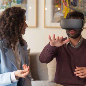 Un paziente si siede su una comoda sedia nello studio di un terapeuta, indossa un